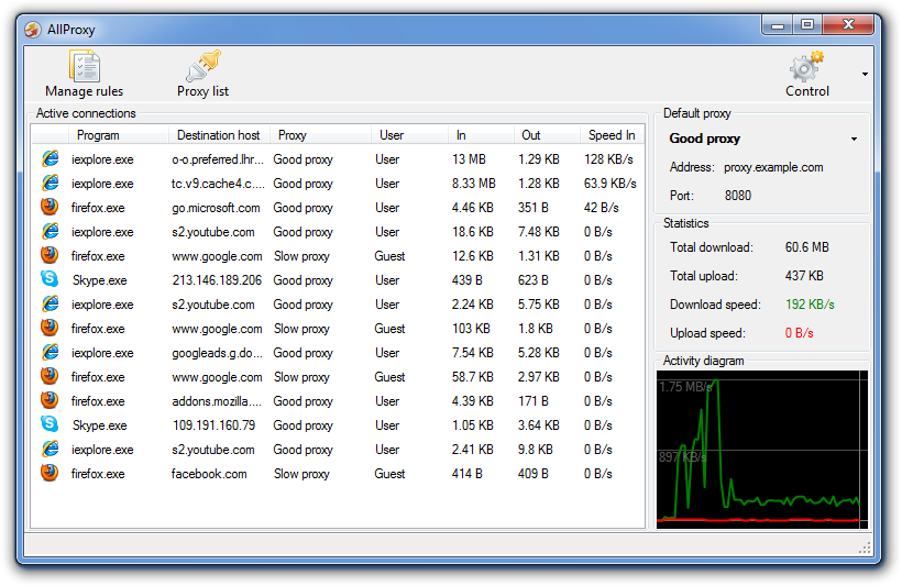 Powerful proxifier and a proxy configuration tool. You can setup facebook proxy, youtube proxy, socks proxy or any other kind of proxys. You can connect to most popular proxy servers with custom proxy settings. It's easy to bypass proxy, unblock proxy, redirect all network connections using anonymous proxy, your own proxy list or proxy sites.